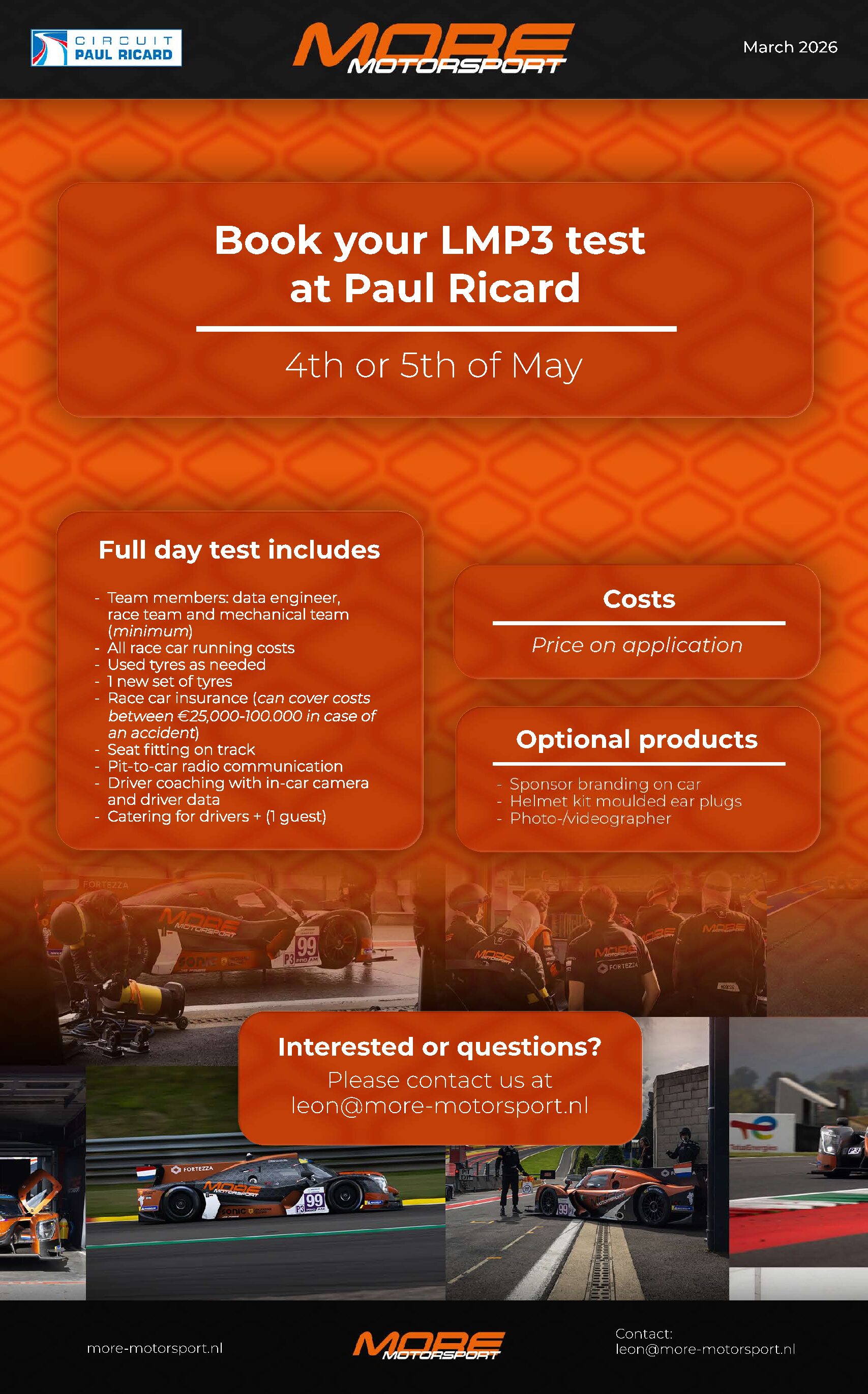 May 4, 2026 Categories Upcoming events Tags Share Related postsAugust 11, 2026LMP3 Test Spa-FrancorchampsRead moreFebruary 17, 2026LMP3 Test Le CastelletRead more